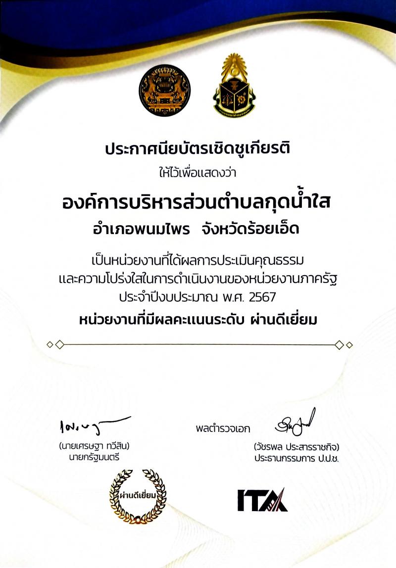รับประกาศเกียรติคุณองค์กรปกครองส่วนท้องถิ่น ที่มีผลการประเมินคุณธรรมและความโปร่งใสของหน่วยงานภาครัฐ (ITA) ประจำปีงบประมาณ พ.ศ. 2567