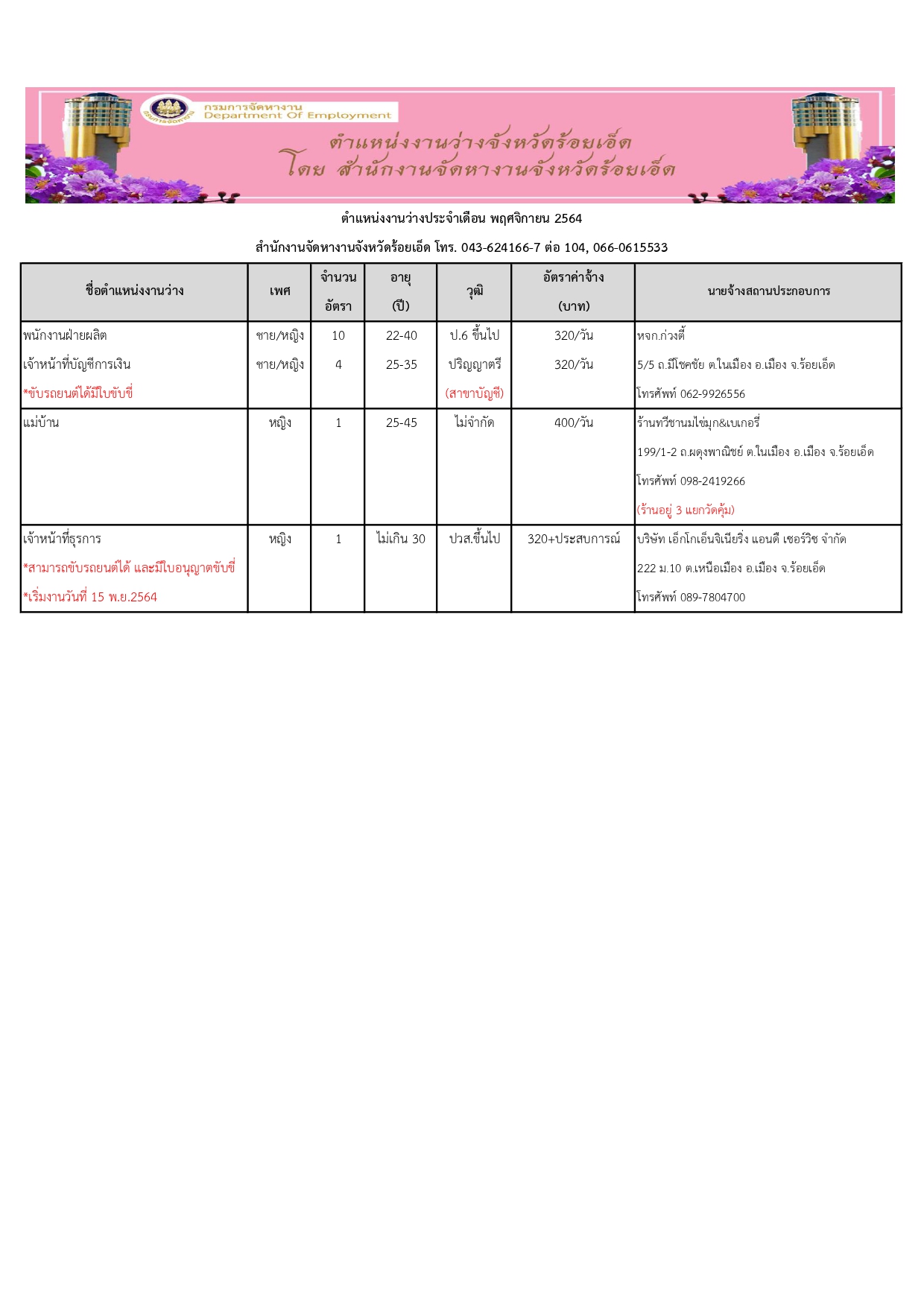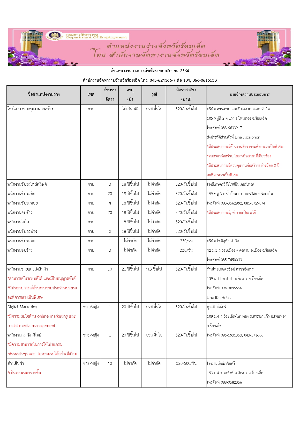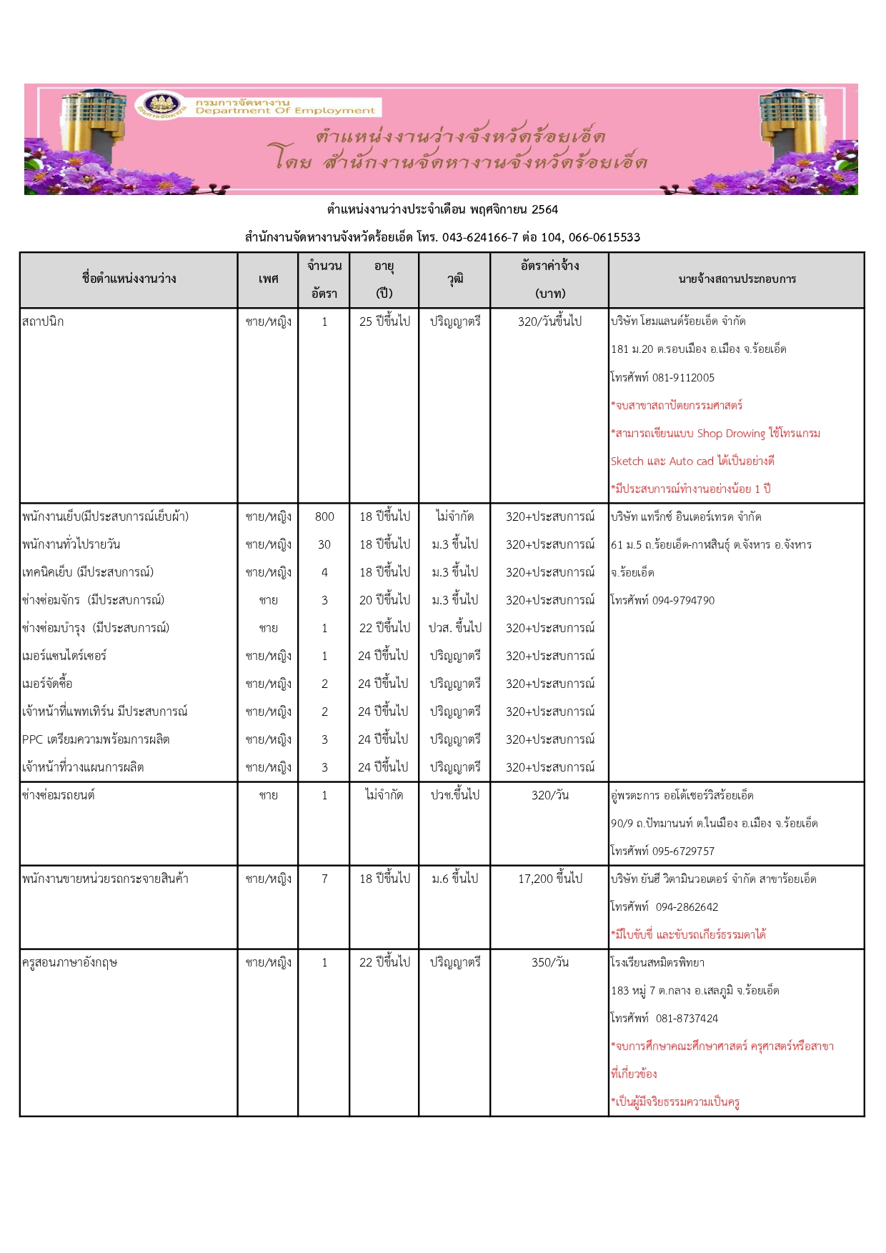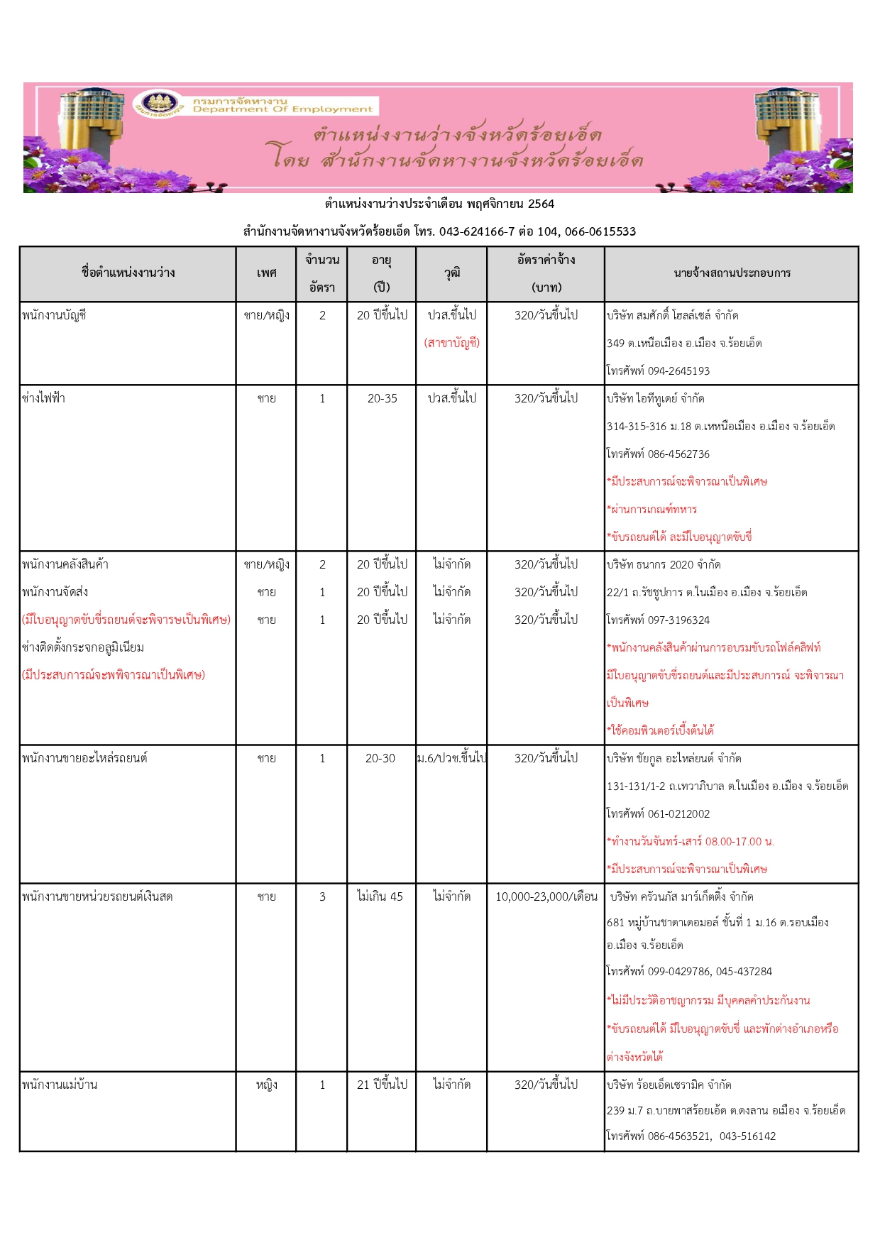 ตำแหน่งงานว่างประจำเดือนพฤศจิกายน 2564 (สำนักงานจัดหางานจังหวัดร้อยเอ็ด)