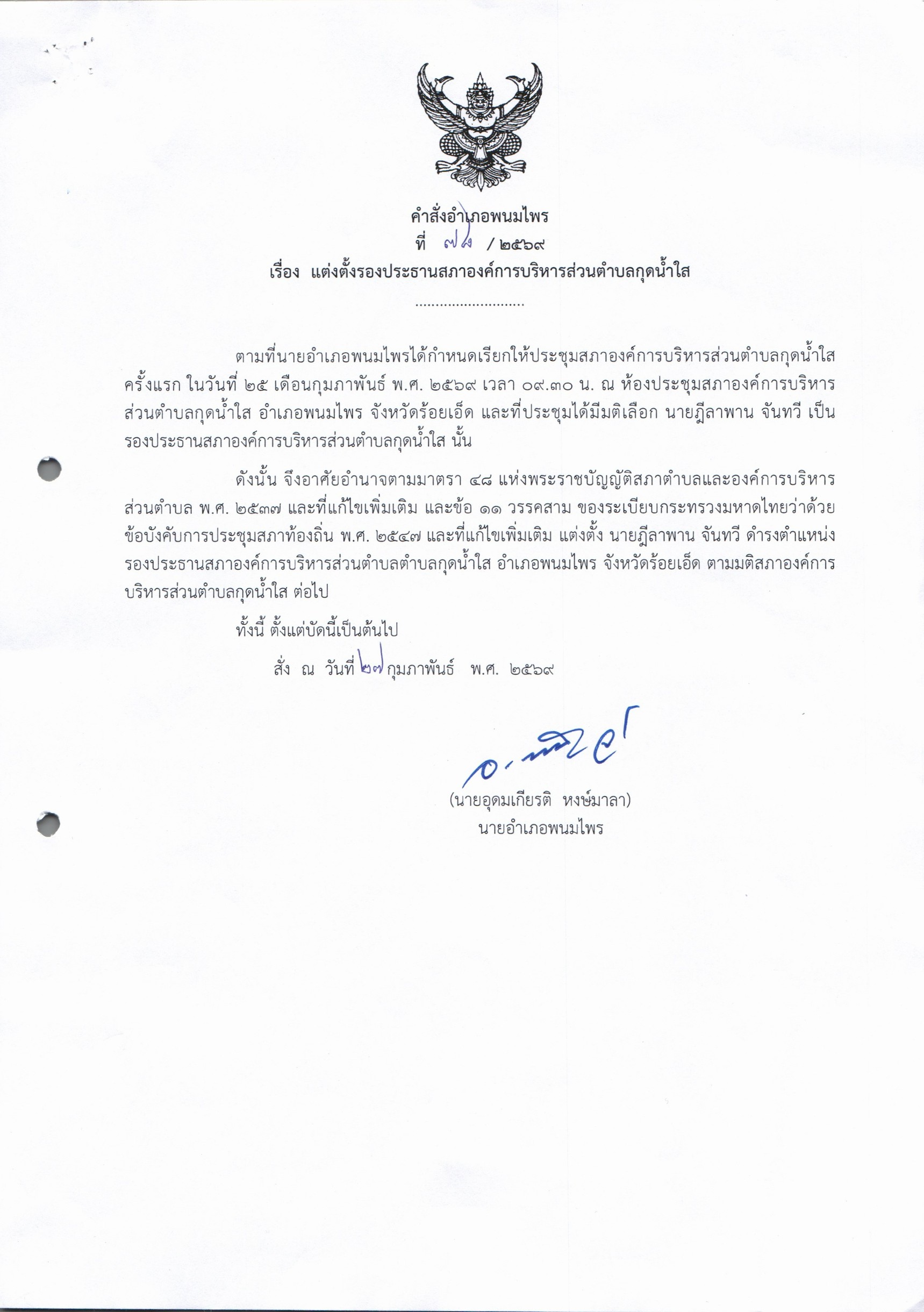 แต่งตั้งรองประธานสภาองค์การบริหารส่วนตำบลกุดน้ำใส