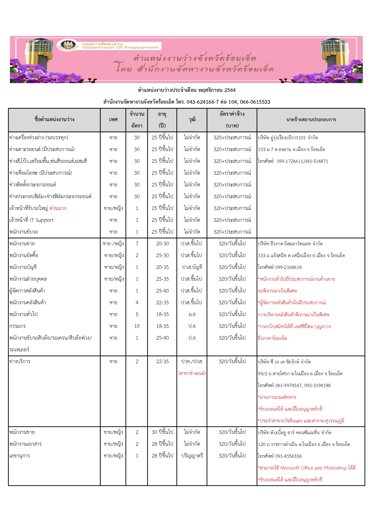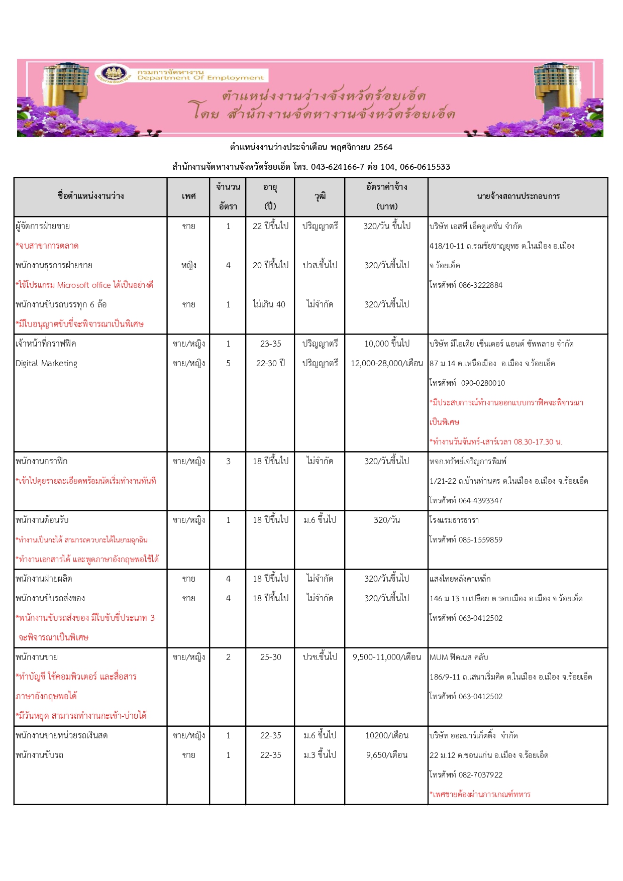 ตำแหน่งงานว่างประจำเดือนพฤศจิกายน 2564 (สำนักงานจัดหางานจังหวัดร้อยเอ็ด)